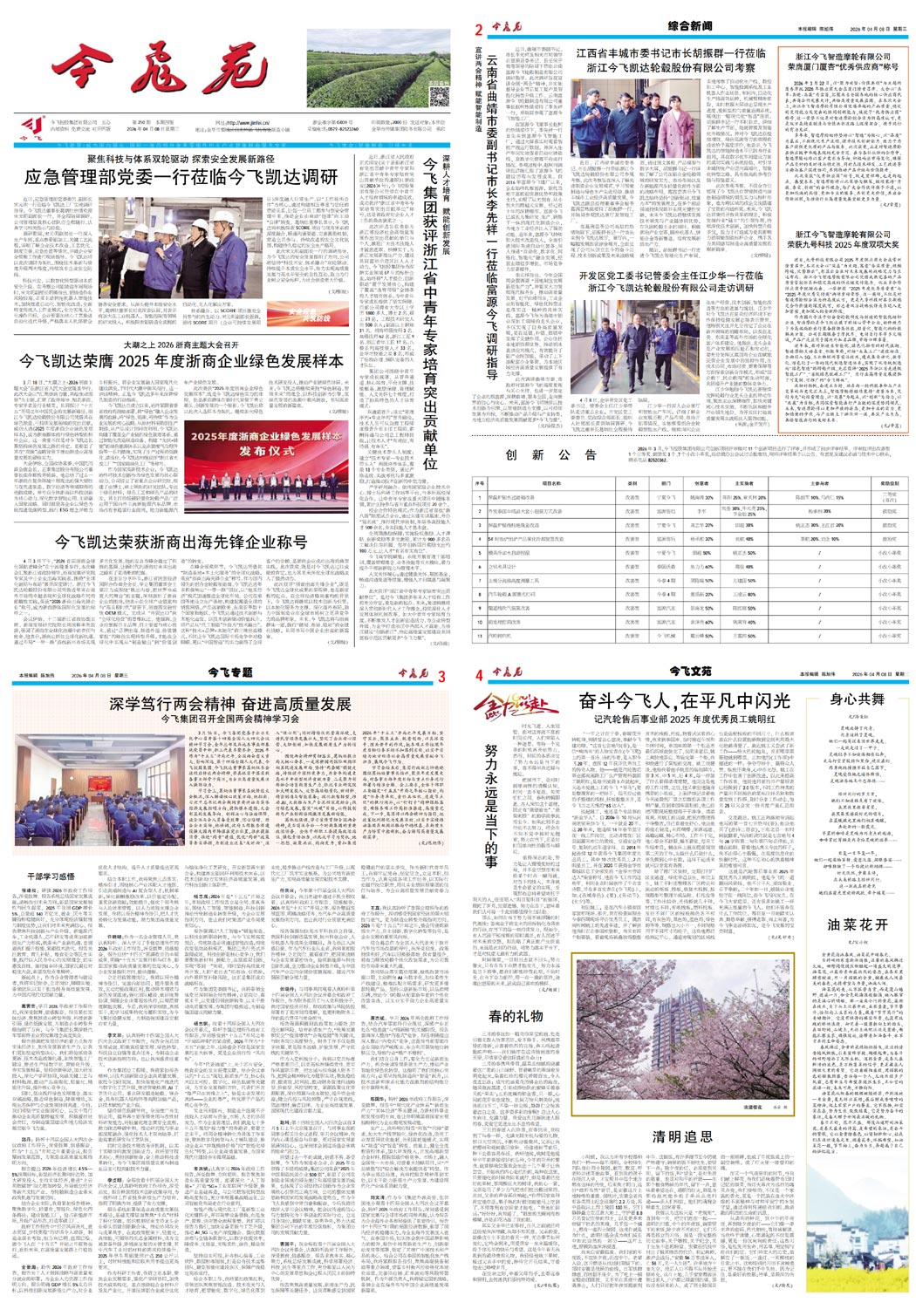 聚焦科技与体系双轮驱动,探索安全发展新路径|应急管理部党委一行莅临今飞凯达调研大潮之上2026浙商主题大会召开|今飞凯达荣膺2025年度浙商企业绿色发展样本今飞凯达荣获“浙商出海先锋企业”称号深耕人才培育 赋能创新发展|今飞集团获评“浙江省中青年专家培育突出贡献单位”浙江今飞智造摩轮有限公司荣膺厦门厦杏“优秀供应商”称号浙江今飞智造摩轮有限公司荣获九号科技2025年度双项大奖创 新 公 告开发区党工委书记管委会主任江少华一行莅临浙江今飞凯达轮毂股份有限公司走访调研宣讲两会精神 赋能智能制造|云南省曲靖市委副书记、市长李先祥一行莅临富源今飞调研指导江西省丰城市委书记、市长胡振群一行莅临浙江今飞凯达轮毂股份有限公司参观考察深学笃行两会精神 奋进高质量发展|今飞集团召开全国两会精神学习会两会精神干部学习感悟身心共舞奋斗今飞人,在平凡中闪光——记汽轮售后事业部2025年度优秀员工姚明红春的礼物清明追思努力永远是当下的事油菜花开